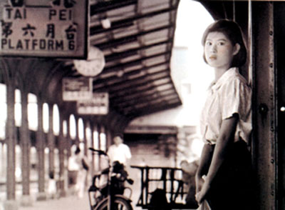 その不安を切り取ったワンショットが写真の彼女だ。場所は首都台北。一年早く上京した近所の先輩アワンが出迎えにくるはずの駅のプラットホームに、アワンの姿をさがす彼女の制服姿がある。手にもつ袋には、アワンの祖父が栽培したサツマイモが入っているはずだ。クリッとした瞳の田舎娘まるだし。どうも素人っぽい。それもそのはず、演じる彼女は台北市内で侯孝賢監督に映画出演を誘われてからさして時間がたっていない。この監督のすごさは、そんな女優の素人臭さを生かして、幼馴染の相手への言葉にできぬ、都会生活の寂しさの入り混じった慕情を、控えめに表現しているところだろう。